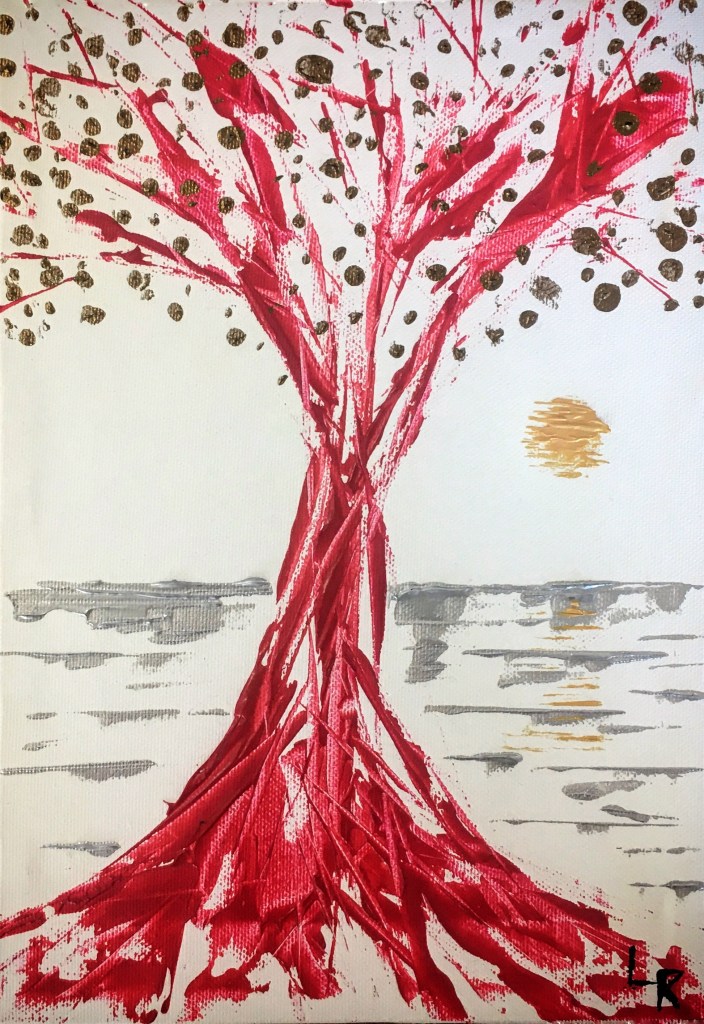 30 H x 20 W cm, acrylic on canvas made with painting palette knife. This “experiment” was a prerequisite for creating the “Autumn” painting. I later decided to give life to the tree by putting bronze leaves on it and accompanying it to a metallic seascape.