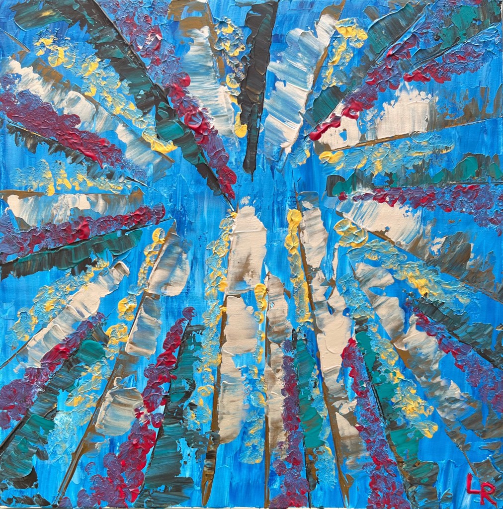 40 H x 40 L cm, acrylic on canvas made with painting palette and brush. A walk in the woods was an inspiration for the creation of this painting, the point of view is mine that I look towards the sky. To paint I often refer to Edvard Munch’s advice, “| don’t paint what I see. But what I saw. “(Kristania, 1890). With this I certainly do not want to compare myself to the teacher, I simply make the thought of him my own.