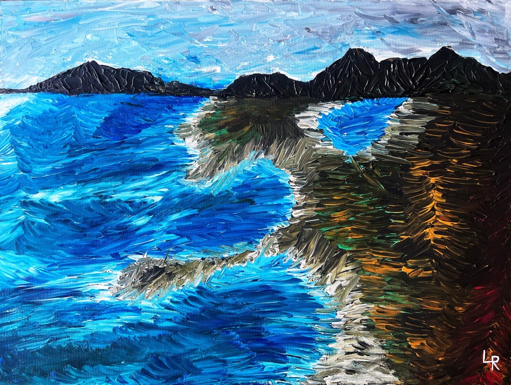 30 W x 30 H, acrylic on canvas made with painting palette knife. Through this painting, I sought to capture the vibrant memories of the idyllic days I spent on the beaches of Sardinia, gazing out at the mesmerizing sea. I wanted to transport the viewer to those refreshing moments, where I felt immersed in the rhythmic embrace of the waves. The play of sunlight on the water’s surface, with its metallic glimmers and frothy white foam, inspired me to recreate the dynamic energy of the scene on canvas. Acrylic colors became my medium of choice, as they possess a unique quality that allows me to bring forth a sense of tactile depth and three-dimensionality to my artwork. I invite you to immerse yourself in this piece and relish the experience it evokes.